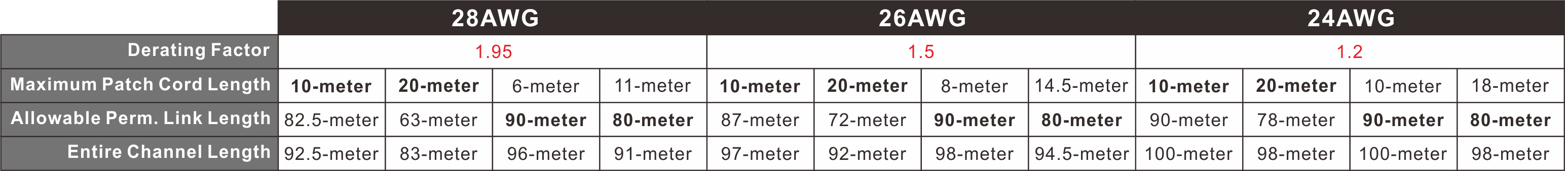Of course, there’s a trade-off. Thinner conductors mean higher attenuation, so careful planning is key. The formula to follow is: (de-rating factor × patch cord length) + horizontal cable length ≤ 102 meters