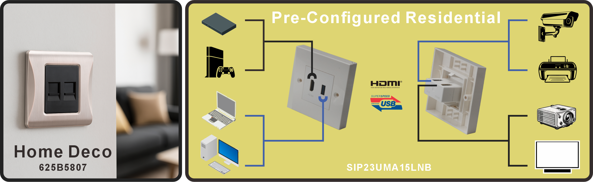 For short-distance 4K video or high-speed data, the SIP23UMA15LNB built-in faceplate supports USB 3.2 and HDMI 2.0 signals — perfect for linking laptops, game consoles, webcams, or HDTVs through the wall.