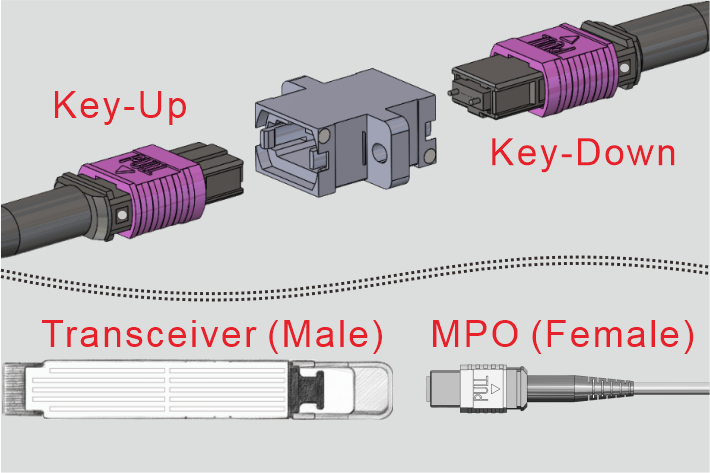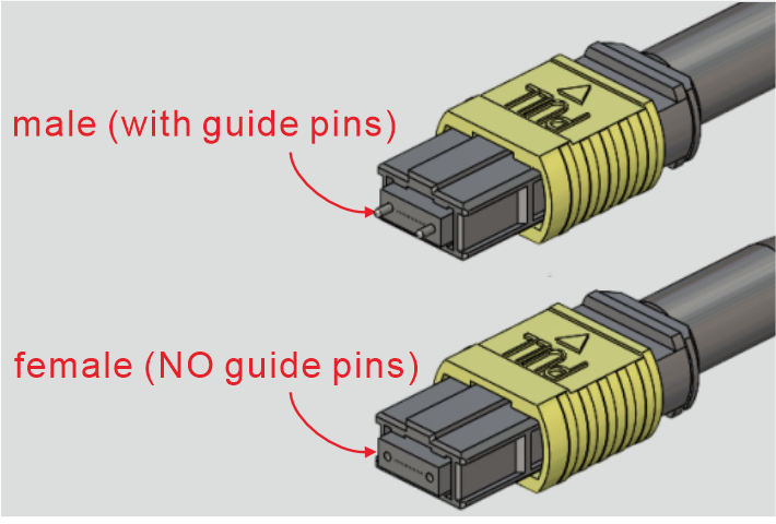 Proper mating of two MPO connectors requires a male-to-female connection. MPO male connectors have two small guide pins that ensure precise fiber alignment with the guide holes in the female connector. Since optical modules like transceivers always have built-in male connectors with guide pins, the MPO cable end that connects to the transceiver must be female.Keying