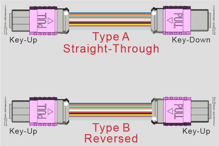 Ensuring correct polarity is often the most complex part of MPO cabling. The most common methods are: Type A (Straight-Through) maps Fiber 1 to 1, 2 to 2, and so on, requiring a polarity flip at the transceiver or with a patch cord. Type B (Reversed) maps Fiber 1 to 12, 2 to 11, etc., letting the cable handle the flip, which makes it the preferred choice for direct transceiver-to-transceiver links.Breakout Types