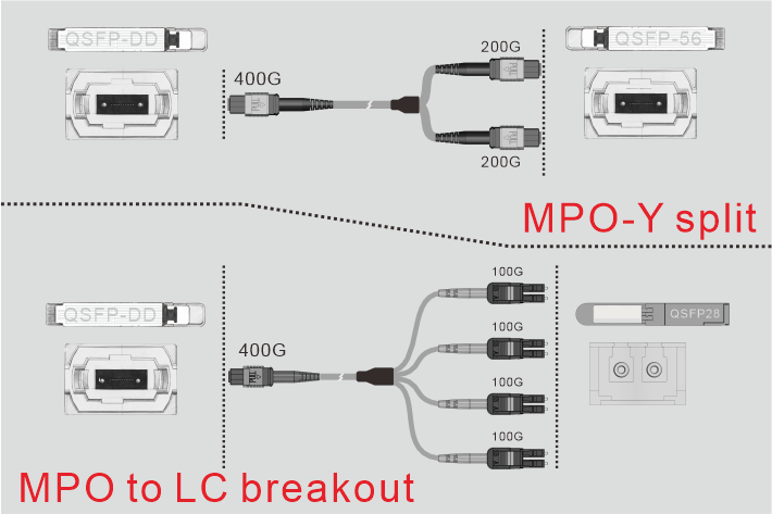MPO cables are frequently used as breakout cables, splitting a single multi-fiber connector into two lower-speed MPO connectors or multiple duplex LC connectors. For example, an MPO Y-cable can split a single 400G MPO trunk into two separate 200G MPO connectors. MPO-to-LC breakout cables break a parallel optic link into lower-speed duplex ports, such as an MPO-16 800G trunk splitting into eight 100G LC duplex connectors.Fiber Mode and Wavelength: SMF vs. MMF
