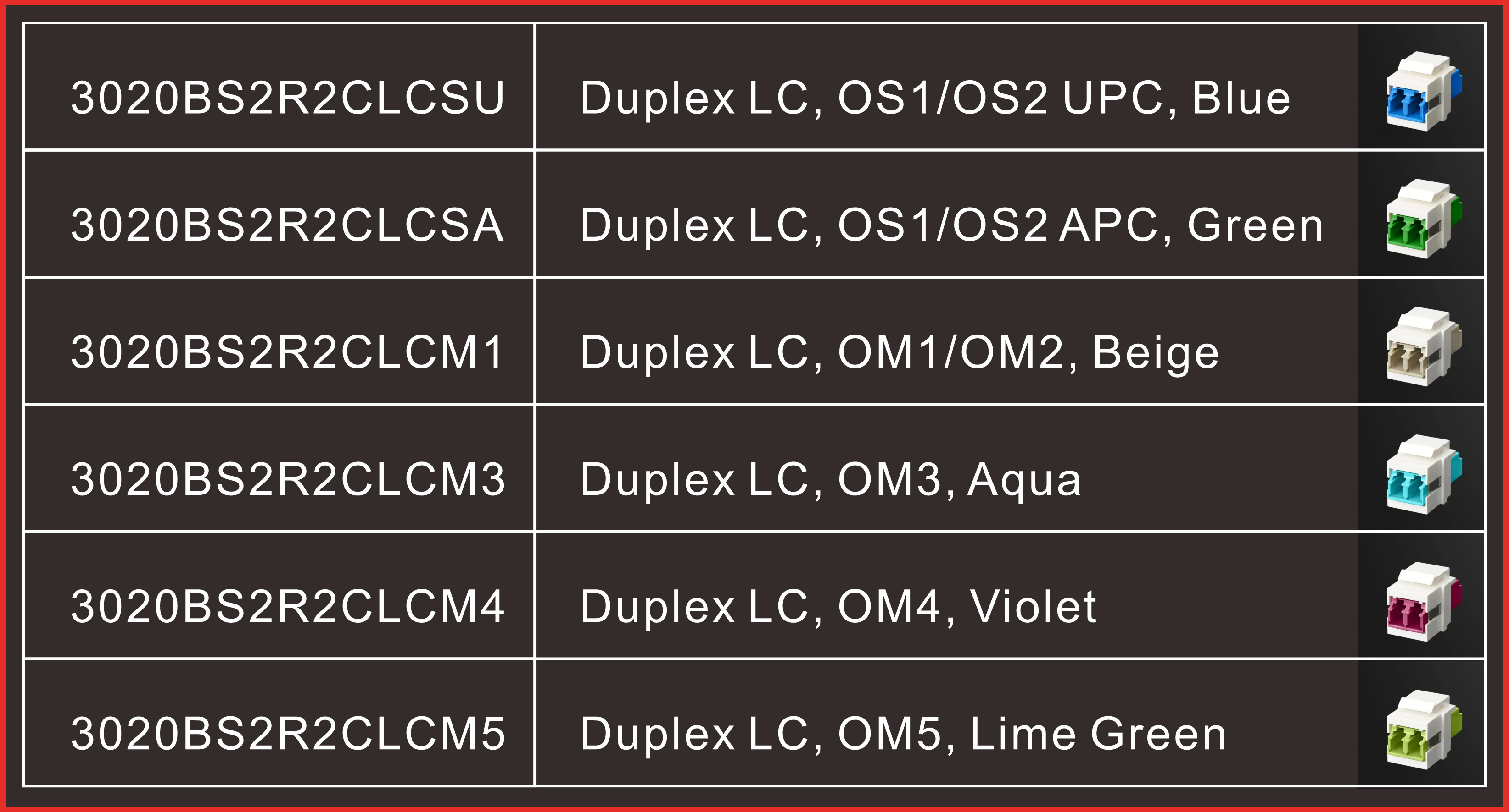The Quick-Snap Bezel comes preloaded with a Duplex LC fiber optic adapter, designed for high-density network environments like data centers and telecom racks. Its compact footprint supports two fibers per port, helping maintain polarity and double throughput in tight patching areas. The default configuration features an OS1/OS2 UPC blue adapter, but options also include APC green for single-mode, and beige (OM1/OM2), aqua (OM3), violet (OM4), or lime green (OM5) for multimode setups — all matched to the fiber spec with industry-standard color codes.