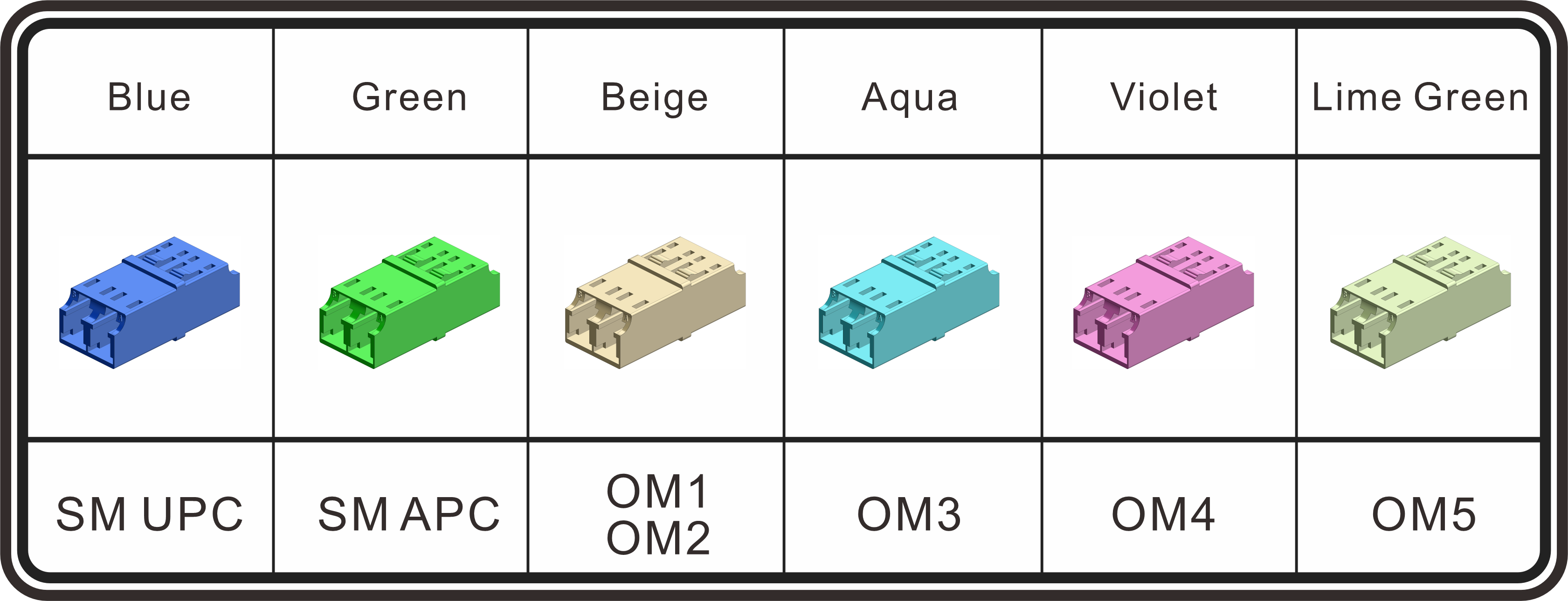 Color coding ensures quick identification: blue for SM UPC, green for SM APC, beige for OM1/OM2, aqua for OM3, violet for OM4, and lime green for OM5.
