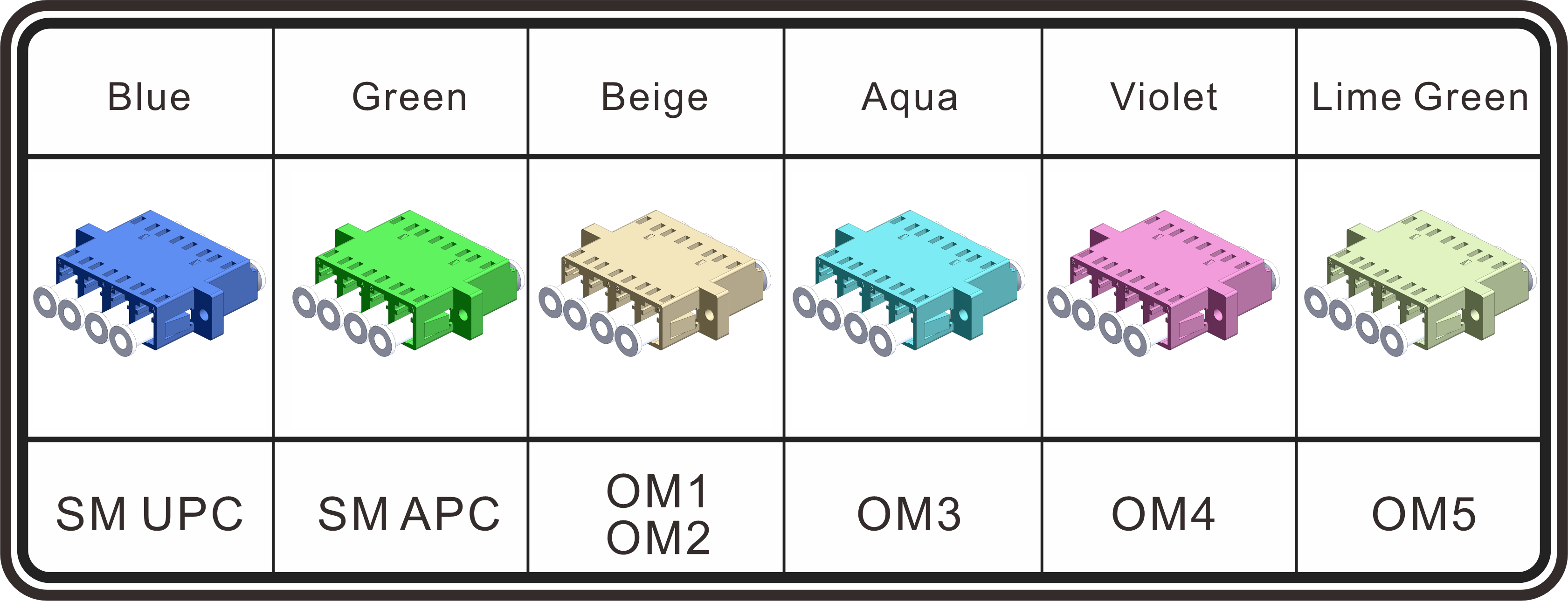Color coding ensures quick identification: blue for SM UPC, green for SM APC, beige for OM1/OM2, aqua for OM3, violet for OM4, and lime green for OM5.