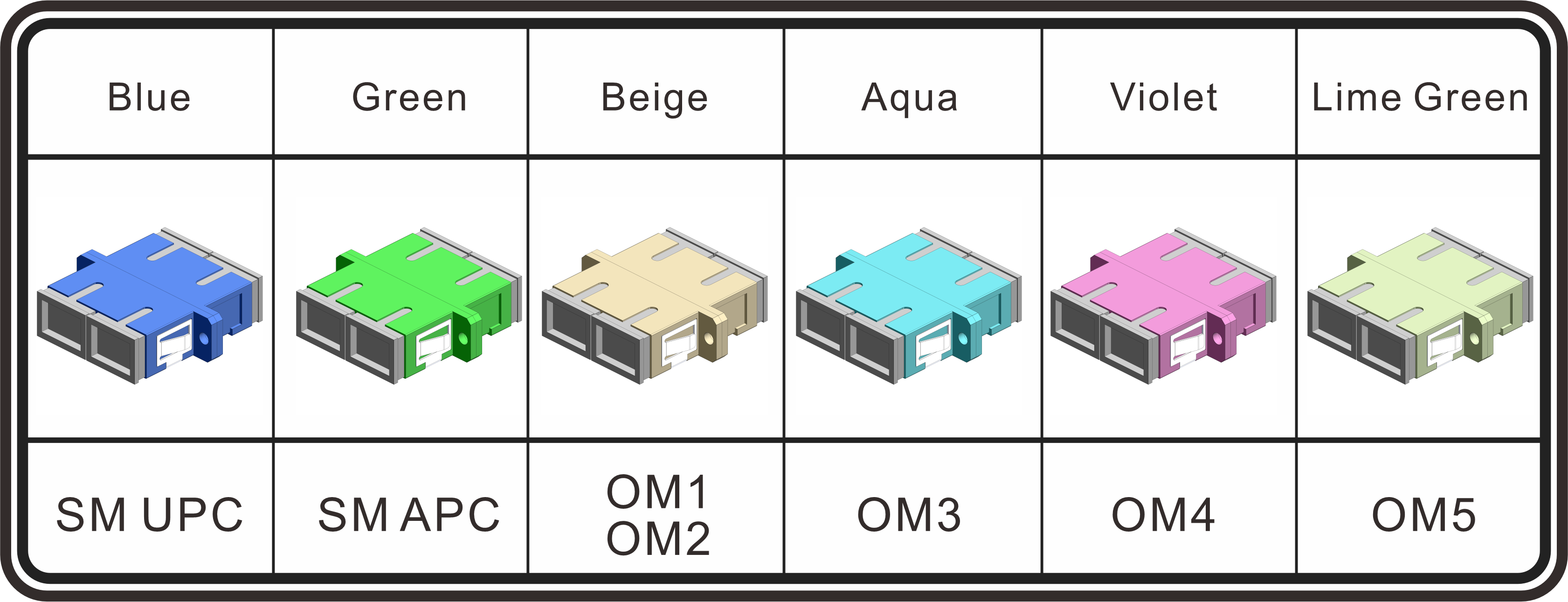Adapters are color-coded for quick recognition: blue for SM UPC, green for SM APC, beige for OM1/OM2, aqua for OM3, violet for OM4, and lime green for OM5.