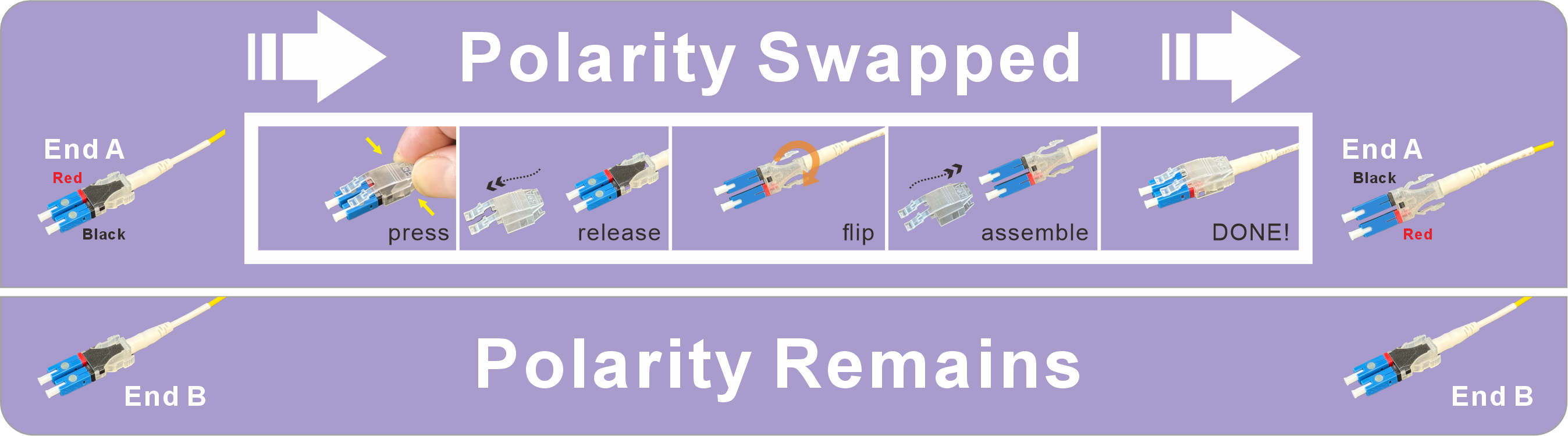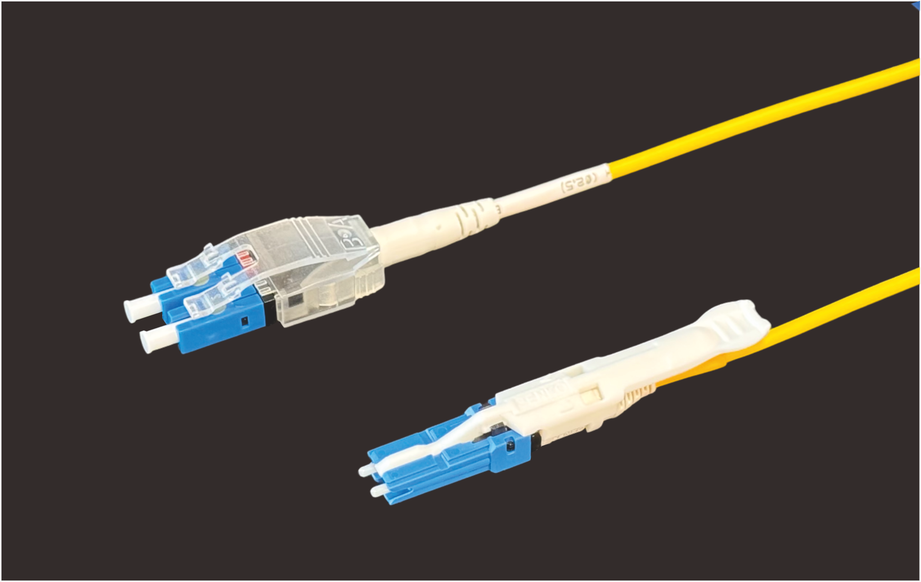 The LC-to-SENKO CS® patch cord features a PoliSwap LC connector on one end and a SENKO CS® connector on the other. The PoliSwap end allows field-reversible Tx/Rx polarity by flipping the latch, ensuring proper signal flow whenever needed. Designed for next-generation data center upgrades, the CS®–LC patch cord enables a smooth transition from legacy LC systems to high-speed CS® interfaces found on OSFP and QSFP-DD transceivers.