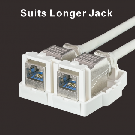 Though compact in size, the interior comfortably fits two full-size keystone jacks (up to 20.8mm W × 24.1mm H × 46.5mm L each). Cable saddles and tie slots inside provide excellent strain relief. The cover and ID label lid open easily by hand - no tools needed.