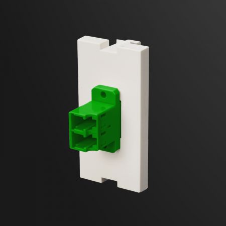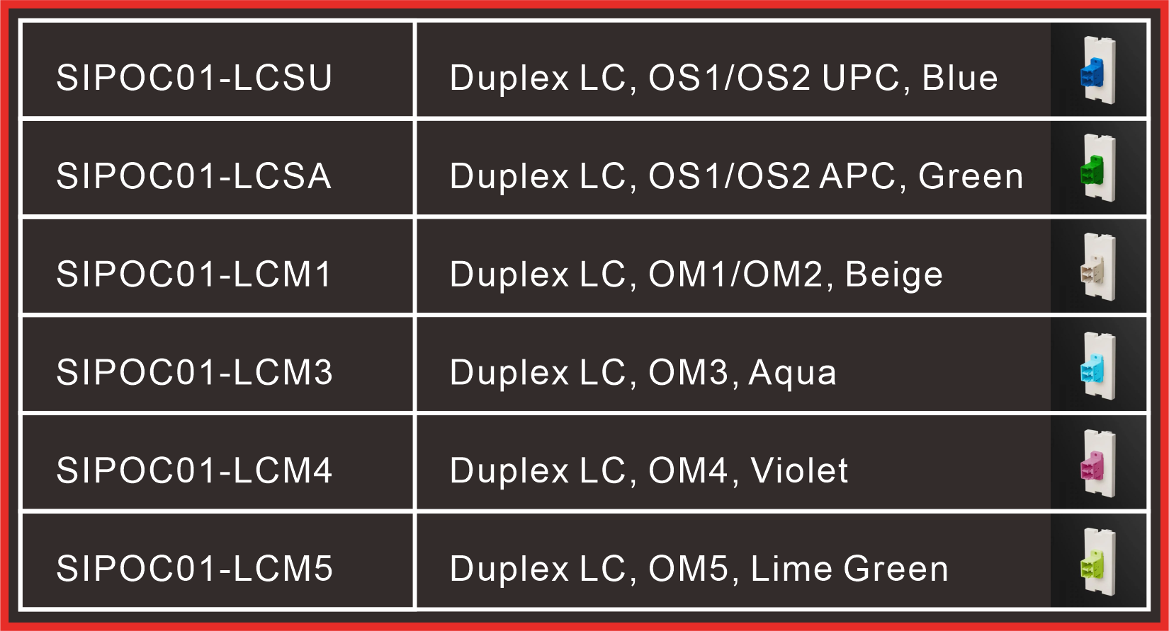 The SIP unit comes loaded with one Duplex LC fiber optic adapter, ideal for high-density network setups such as data centers and telecom racks. Supporting OS1/OS2 single-mode and OM1–OM5 multimode fibers, it features industry-standard color coding with blue (UPC) as default for single-mode, and green (APC) plus beige, aqua, violet, or lime green for multimode options. The Duplex LC adapter allows two fibers per port, maximizing throughput and maintaining polarity in compact environments.