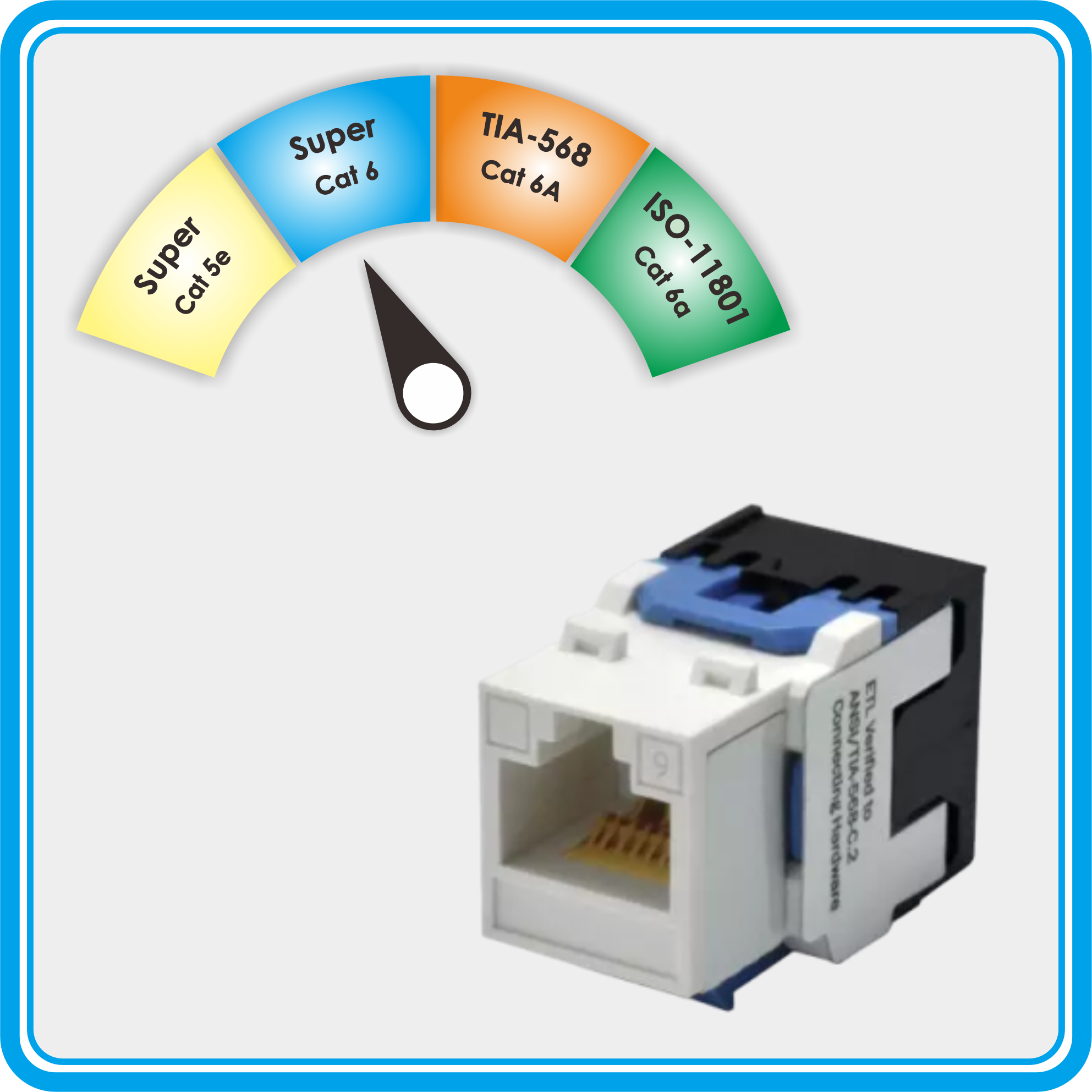 Las consideraciones para ejecutar 802.3bz 5GBASE-T para soportar una mayor tasa de datos de AP inalámbrico empujarían los anchos de banda requeridos a 312MHz, muy por encima de la especificación de 250MHz de ANSI/TIA 568.2-D e ISO/IEC-11801 Categoría 6. HCI Los conectores con clasificación de componente Super Cat 6 superan el ancho de banda extendido de hasta 350MHz. Cuenta con la técnica de compensación de inductancia para reducir el campo de franja y mejorar NEXT, FEXT y la pérdida de retorno. Esta técnica está patentada bajo el US 9391405 B1. Fabricado en Taiwán Hardware de conexión Cat 6 certificado por ETL y probado trimestralmente Cumple con 4PPoE Patentado US 9391405 B1