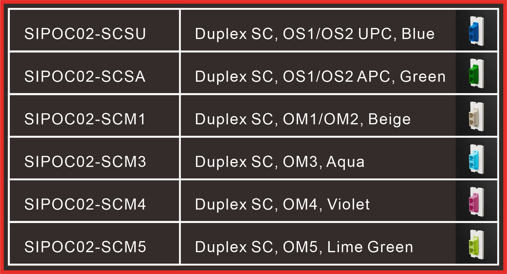 SIP1C2 / SIP2C2 Sub-Inserto 1P, 1-Puerto / 2-Puertos, 25x50mm SIP17N Sub-Inserto 1P, 1-Puerto con obturador, 25x50mm SIPA51N Sub-Inserto 1P, 1-Puerto con obturador a 45°, 25x50mm SIPK33G Sub-Inserto Cat 6 1P, 1-Puerto con obturador, 25x50mm SIPK44G Sub-Inserto Cat 6 1P, 1-Puerto con obturador a 45°, 25x50mm SIPH15CNFF Sub-Inserto 1P, D-SUB HD15, 25x50mm SIPR2CN Sub-Inserto 1P, RCA Audio Tipo Soler, 25x50mm SIPR3CN Sub-Inserto 1P, RCA A/V Tipo Soler, 25x50mm SIPR2CAG Sub-Inserto 1P, RCA Audio, 25x50mm SIPR3CAG Sub-Inserto 1P, RCA A/V, 25x50mm SIPR3CACVG Sub-Inserto 1P, Video Componente (Y/Pb/Pr), 25x50mm SIPR2CBBPG Sub-Inserto 1P, Tipo de Soldadura de Poste de Conexión, 25x50mm SIPR2CASPG Sub-Inserto 1P, Poste de Conexión, 25x50mm SIPOC01-LC Sub-Inserto 1P, Adaptador LC Dúplex, 25x50mm SIPOC02-LC Sub-Inserto 1P, Adaptador LC Cuádruple, 25x50mm SIPOC03-LC Sub-Inserto 1P, Adaptador Cuádruple LC x 2, 25x50mm SIPOC01-SC Sub-Inserto 1P, Adaptador Simple SC, 25x50mm SIPOC02-SC Sub-Inserto 1P, Adaptador Dúplex SC, 25x50mm SIPOC03-SC Sub-Inserto 1P, Adaptador Dúplex SC x 2, 25x50mm