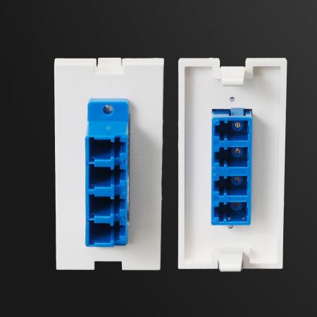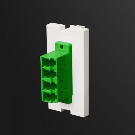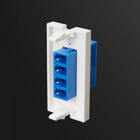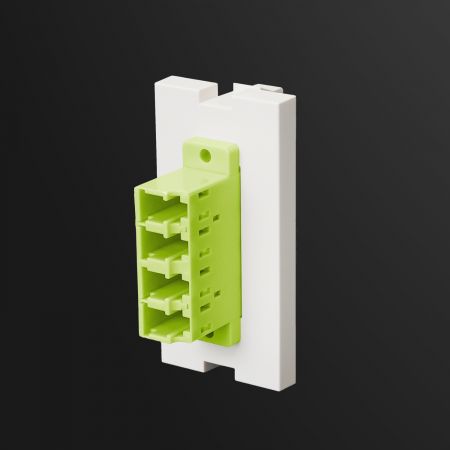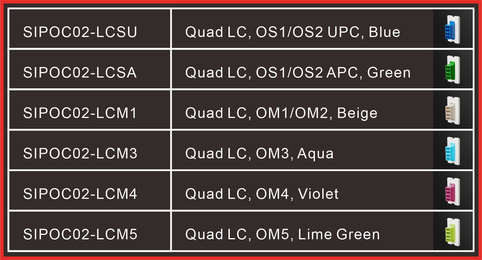 Cette unité SIP est équipée d'un adaptateur fibre optique Quad LC, offrant quatre connexions fibre dans un encombrement compact pour des applications ultra-haute densité. Compatible avec les fibres monomodes OS1/OS2 et multimodes OM1–OM5, les adaptateurs suivent les codes de couleur standard : UPC bleu par défaut pour le monomode, APC vert, et l'ensemble du spectre multimode en beige, aqua, violet et vert lime.