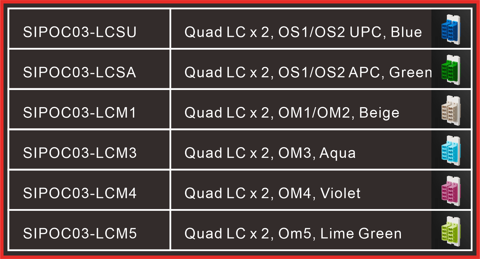 SIPBC / SIPBHC Sous-insertion, vide 25x50mm, demi-vide 12,5x50mm SIP1C2 / SIP2C2 Sous-insertion 1P, 1-Port / 2-Port, 25x50mm SIP3C2 / SIP4C2 Sous-insertion 1.5P, angulaire 1-Port / 2-Port, 37,5x50mm SIPH15CNFF Sous-insertion 1P, D-SUB HD15, 25x50mm SIPR2CN Sous-insertion 1P, type audio RCA solénoïde, 25x50mm SIPR3CN Sous-insertion 1P, RCA A/V Soler Type, 25x50mm SIPR2CAG Sous-insertion 1P, RCA Audio, 25x50mm SIPR3CAG Sous-insertion 1P, RCA A/V, 25x50mm SIPR3CACVG Sous-insertion 1P, Vidéo Composante (Y/Pb/Pr), 25x50mm SIPR2CBBPG Sous-insertion 1P, Type de soudure à bornes, 25x50mm SIPR2CASPG Sous-insertion 1P, Poste de liaison, 25x50mm SIPOC01-LC Sous-insertion 1P, Adaptateur LC Duplex, 25x50mm SIPOC02-LC Sous-insertion 1P, Adaptateur LC Quad, 25x50mm SIPOC03-LC Sous-insertion 1P, Adaptateur LC Quad x 2, 25x50mm SIPOC01-SC Sous-insertion 1P, Adaptateur SC Simplex, 25x50mm SIPOC02-SC Sous-insertion 1P, adaptateur duplex SC, 25x50mm SIPOC03-SC Sous-insertion 1P, adaptateur duplex SC x 2, 25x50mm