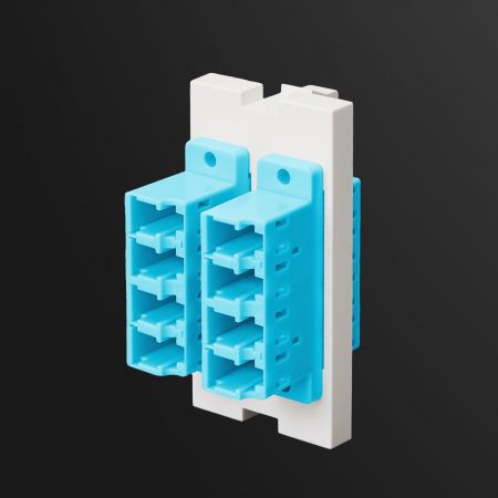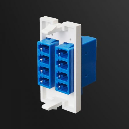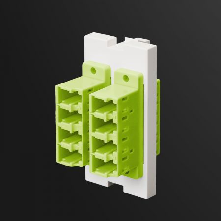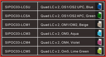 L'unité SIP est équipée de deux adaptateurs en fibre optique Quad LC, doublant la densité de fibre pour des environnements réseau avancés à haute capacité. Supportant les fibres monomodes OS1/OS2 et multimodes OM1–OM5, les adaptateurs utilisent un code couleur standard de l'industrie : bleu (UPC) pour le mode unique par défaut, vert (APC), et toute la palette multimode en beige, aqua, violet et vert lime.