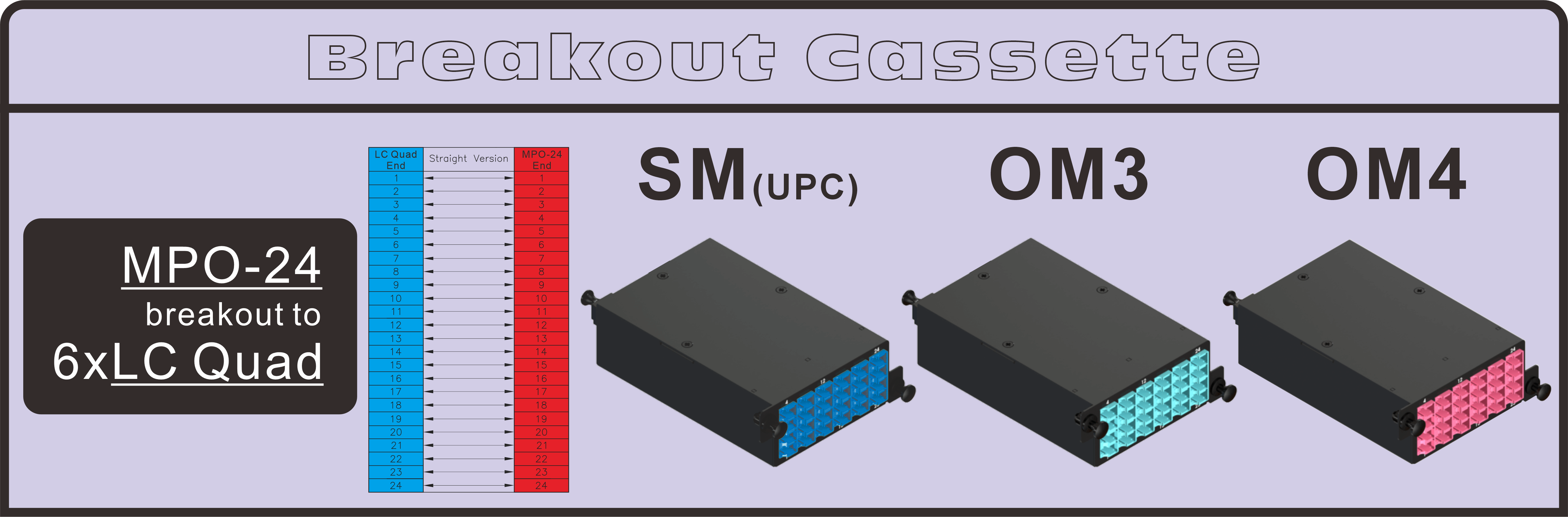 Il MPO-24 per cassette quad a 6×LC si adatta all'involucro configurabile HD da 2RU con spazio per 12 cassette verticali, offrendo un'uscita ad alta densità utilizzando un singolo connettore MPO-24 (con pin), semplificando la gestione dei cavi rispetto alle configurazioni dual MPO-12. Porta 24 fibre a sei porte LC quad per il patching. Disponibile in fibre SM OS2 G.657.A e OM3/OM4 a bassa sensibilità alla curvatura.