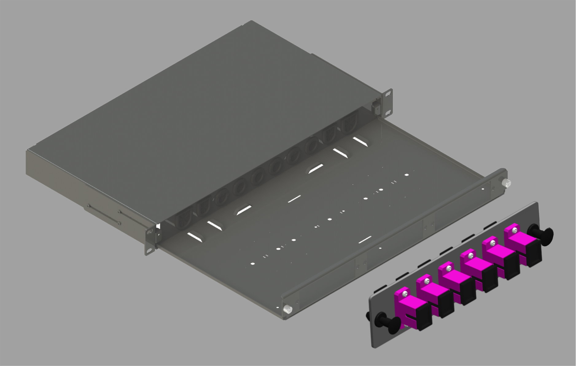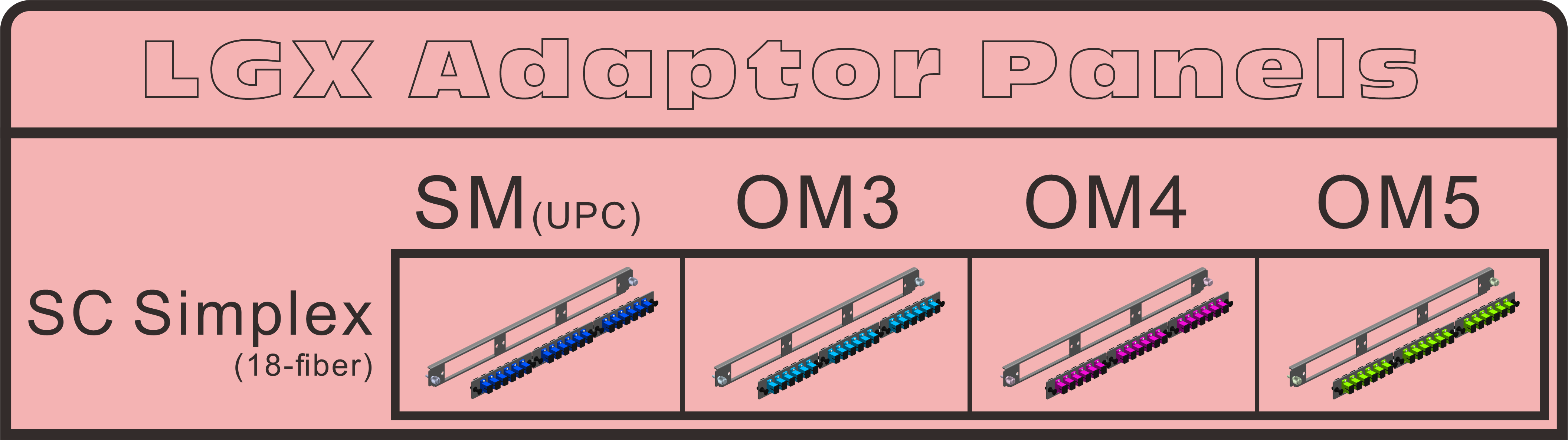 Enkapsul laci gelincir 1RU memanjang dan condong untuk akses yang lebih mudah semasa penyambungan atau penyelenggaraan. Dinding hadapan dilengkapi dengan penyesuai SC Simplex merentasi tiga slot LGX, menyokong 18 serat secara keseluruhan. Perumahan yang dikod warna - biru untuk SM UPC, aqua untuk OM3, ungu untuk OM4, dan hijau limau untuk OM5 - memastikan pengenalan serat yang cepat.