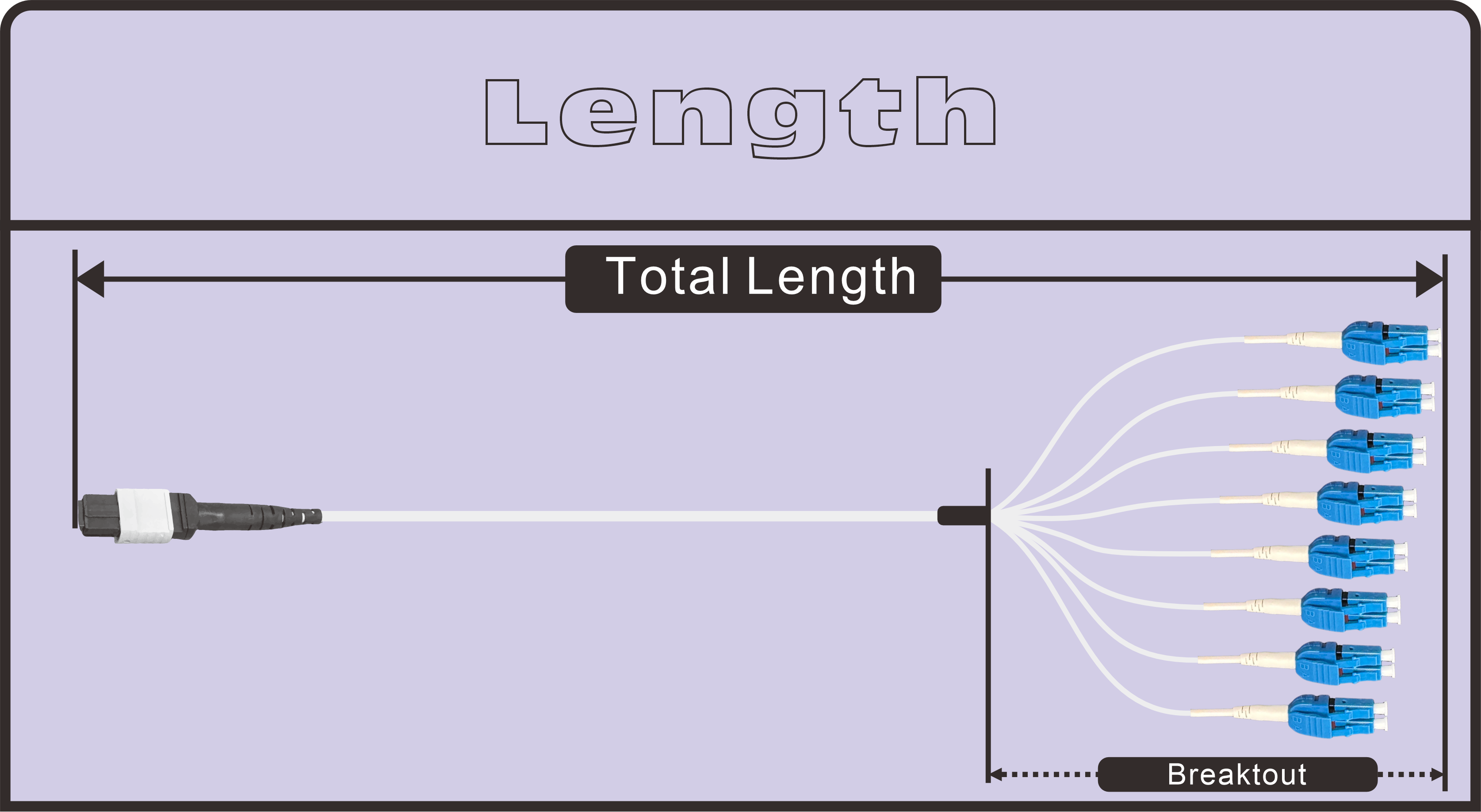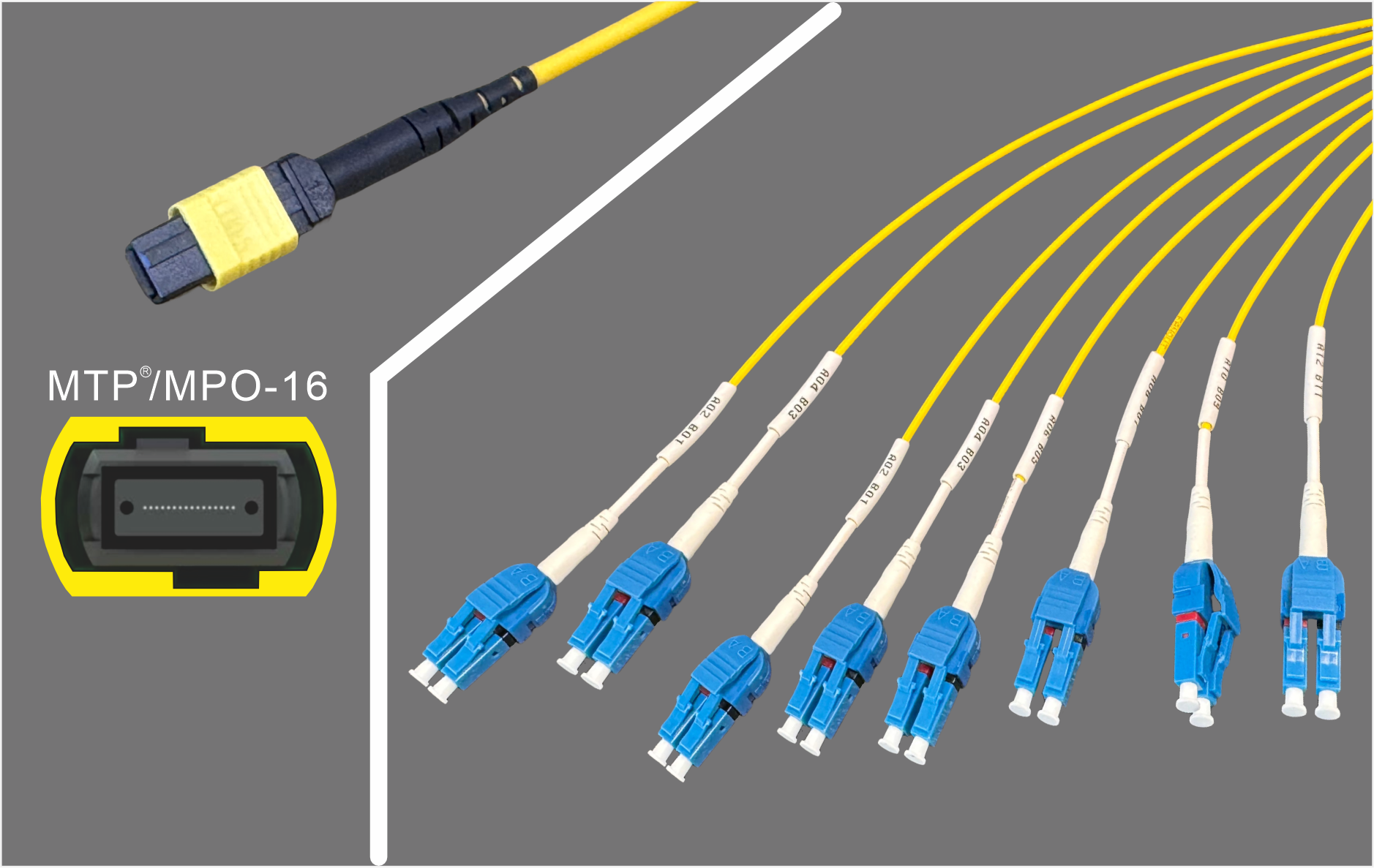 Dibina dengan serat singlemode tahan lentur OS2 G.657.A2. Pilihan penyambung di sisi MPO termasuk MPO atau MTP® dengan jantina perempuan sebagai standard. Sisi LC duplex datang dengan penggilapan UPC secara lalai, menyambung terus ke transceiver. Polariti terbalik adalah lalai untuk menyelaraskan MPO Tx dengan LC Rx untuk penyebaran yang mudah. Namun, sebarang pendawaian khusus boleh dibuat atas permintaan.