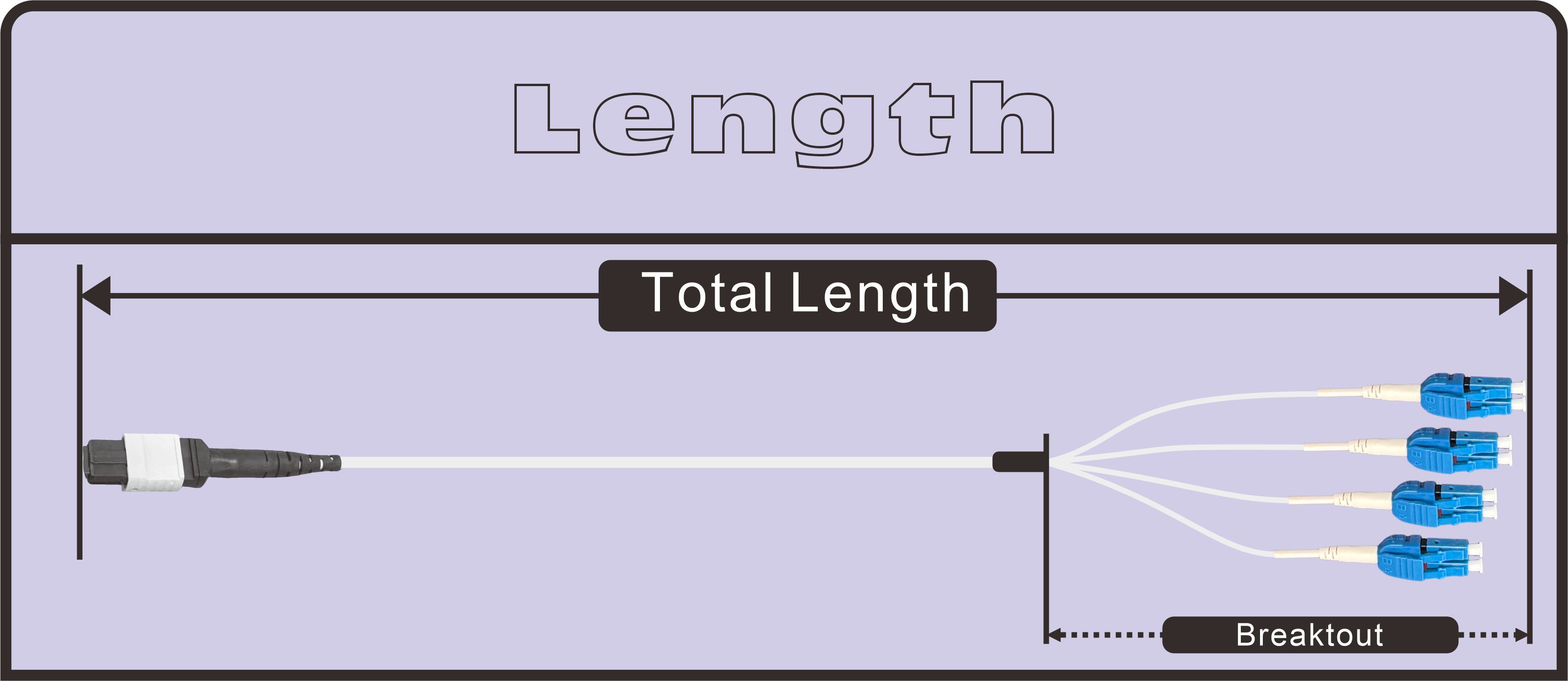 Собрано с использованием одномодового волокна OS2 G.657.A2, нечувствительного к изгибу. Варианты разъемов на стороне MPO включают MPO или MTP® с женским разъемом в качестве стандарта. Сторона LC дуплекс по умолчанию имеет полировку UPC, подключаясь напрямую к трансиверу. Обратная полярность является стандартной. Любая индивидуальная проводка может быть выполнена по запросу.