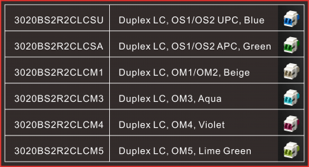 3020BS0D2 Быстросъёмная рамка, пустая 3020BS1D2SPGR Быстросъемная рамка, красный соединительный пост 3020BS1D2SPGK Быстросъемная рамка, черный соединительный пост 3020BS1D2F Быстросъемная рамка, разъем CATV-F 3020BS1D2RGY Быстросъемная рамка, RCA видео желтый 3020BS1D2RGW Быстросъемная рамка, RCA аудио белый 3020BS1D2RGR Быстросъемная рамка, RCA аудио красный 3020BS3NB Быстросъемная рамка, BNC разъем 3020BS1D2ST Быстросъемная рамка, оптоволоконный ST 3020BS2R2CLC Быстросъемная рамка, оптоволоконный дуплекс LC 3020BS2R2CSC Быстросъемная рамка, оптоволоконный симплекс SC