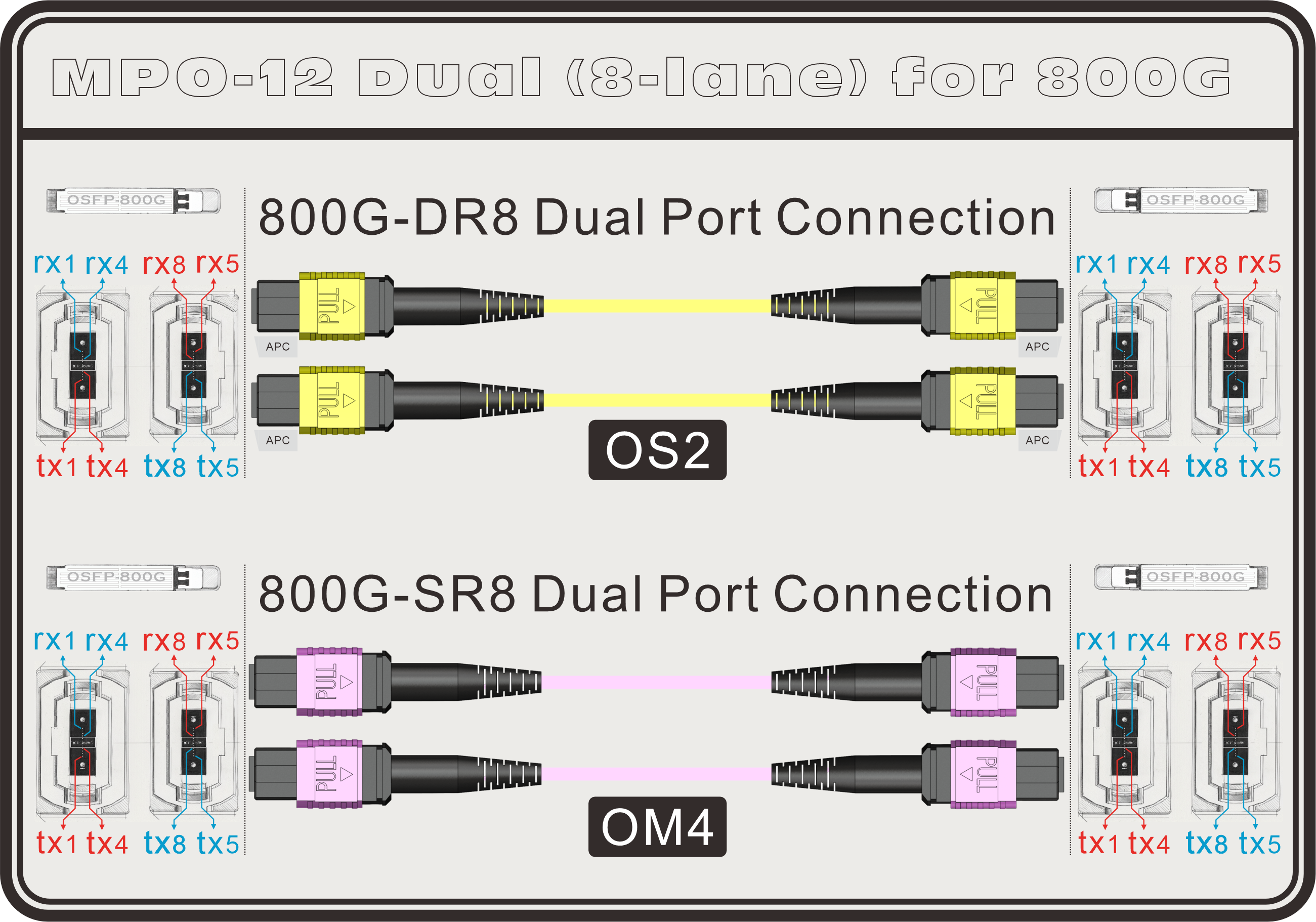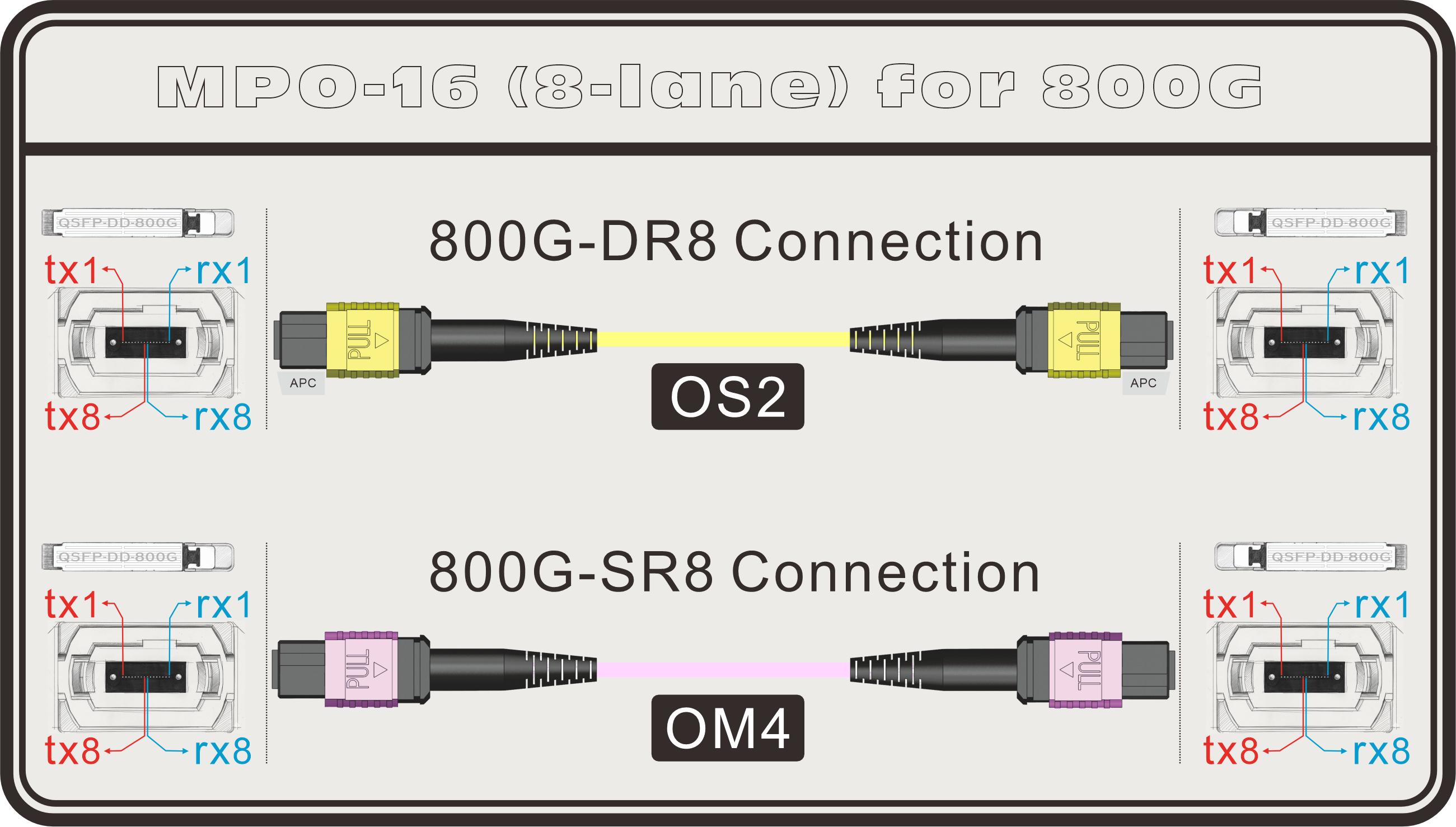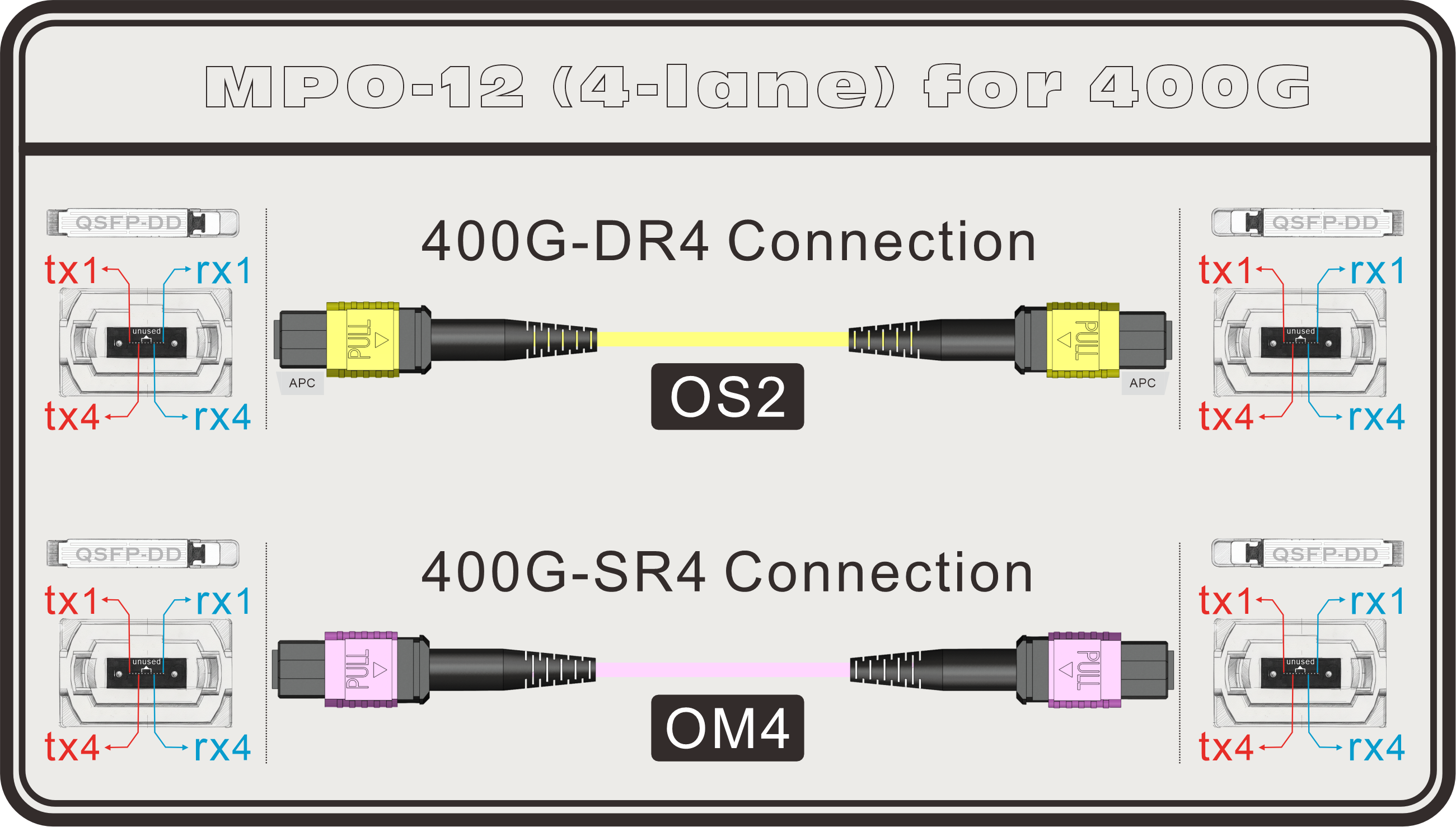 Đối với các liên kết trong trung tâm dữ liệu, sợi quang đa chế độ OM3 và OM4 hỗ trợ khoảng cách lên đến 100 mét. Đối với các liên kết giữa các trung tâm dữ liệu, 400G-DR4 sử dụng sợi quang đơn chế độ OS2 với đánh bóng APC tối ưu hóa tổn thất phản hồi và hỗ trợ khoảng cách lên đến 500 mét.