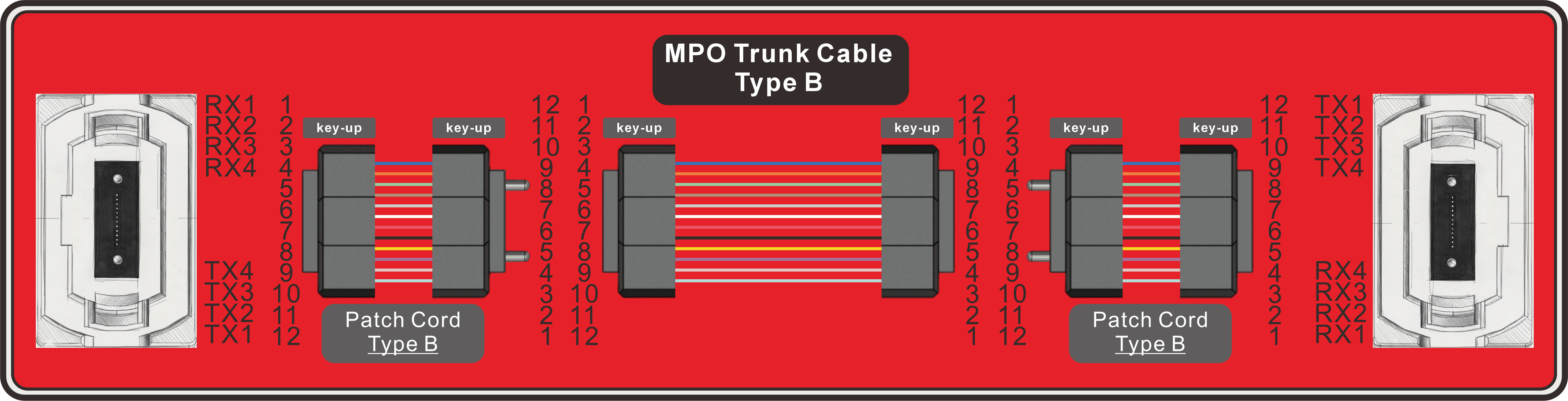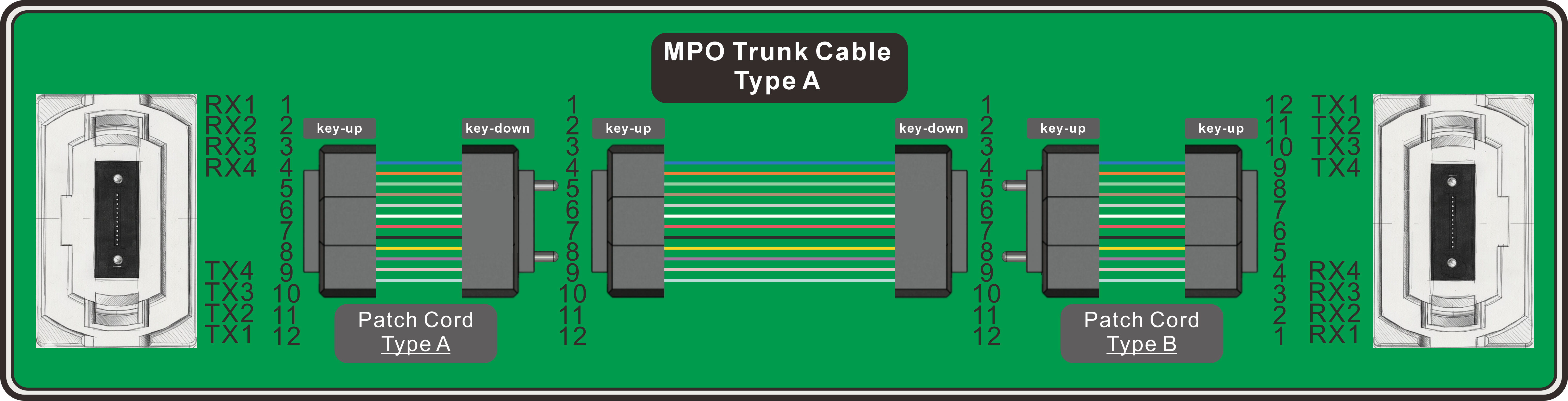 Một dây cáp MPO loại A được sử dụng ở một đầu để kết nối các cổng bảng phân phối với các cổng bộ thu phát tương ứng, và một dây cáp MPO loại B được sử dụng ở đầu kia. Chỉ có một dây cáp loại B có thể nằm trong kênh.
