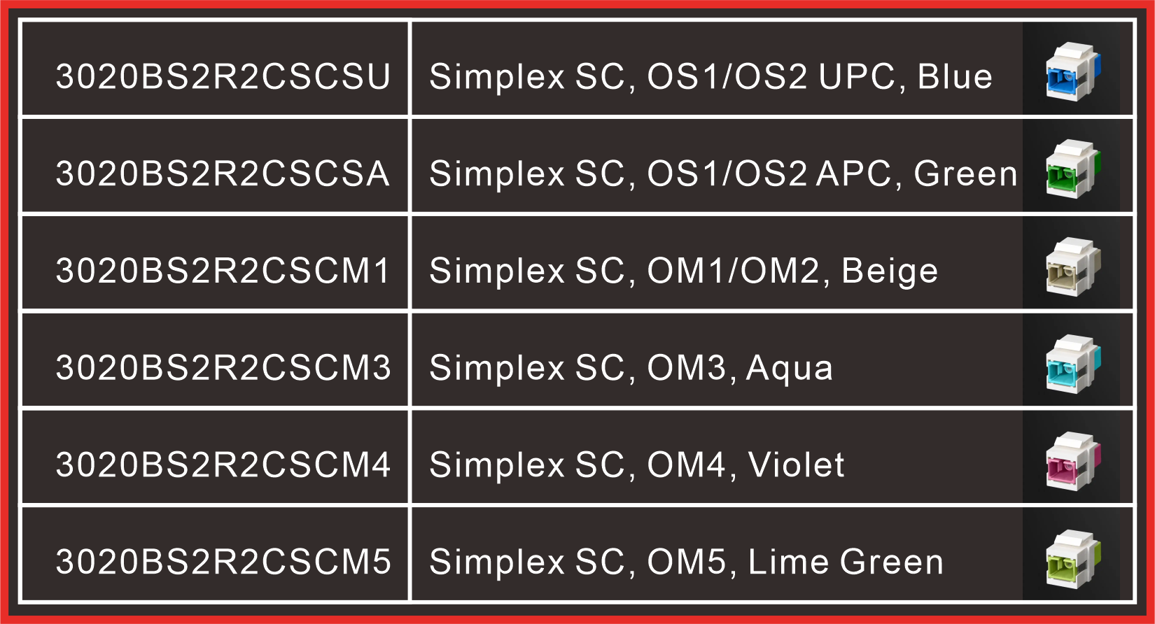 3020BS0D2 Khung nhanh, trống 3020BS1D2SPGR Viền Quick-Snap, Chân kết nối Đỏ 3020BS1D2SPGK Viền Quick-Snap, Chân kết nối Đen 3020BS1D2F Viền Quick-Snap, Kết nối CATV-F 3020BS1D2RGY Viền Quick-Snap, Video RCA Màu Vàng 3020BS1D2RGW Viền Quick-Snap, Âm thanh RCA Màu Trắng 3020BS1D2RGR Viền Quick-Snap, Âm thanh RCA Đỏ 3020BS3NB Viền Quick-Snap, Kết nối BNC 3020BS1D2ST Viền Quick-Snap, Quang học Sợi ST 3020BS2R2CLC Viền Quick-Snap, Quang học Sợi Duplex LC 3020BS2R2CSC Viền Quick-Snap, Quang học Sợi Simplex SC