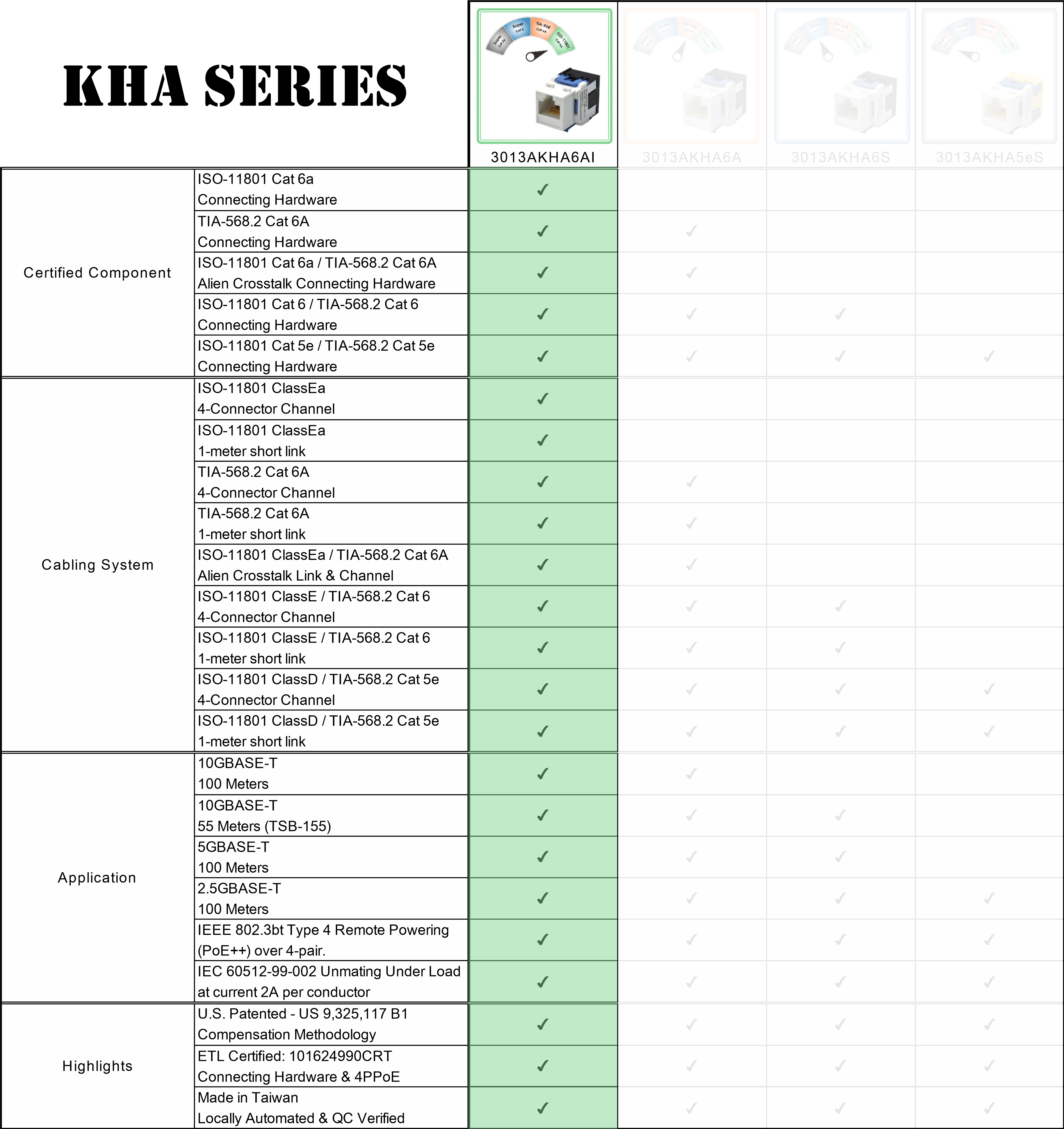 ISO Cat 6a vượt qua TIA Cat 6A. Yêu cầu nghiêm ngặt hơn 3dB góp phần vào việc tăng hiệu suất khoảng 30% ở tần số 500MHz. Điều này cũng cung cấp thêm không gian cho toàn bộ hệ thống cáp đã được lắp đặt trong thực địa. Đó là điều làm cho 3013AKHA6AI khác biệt so với các mẫu 3013AKHA khác.