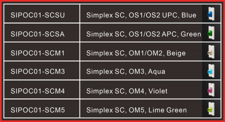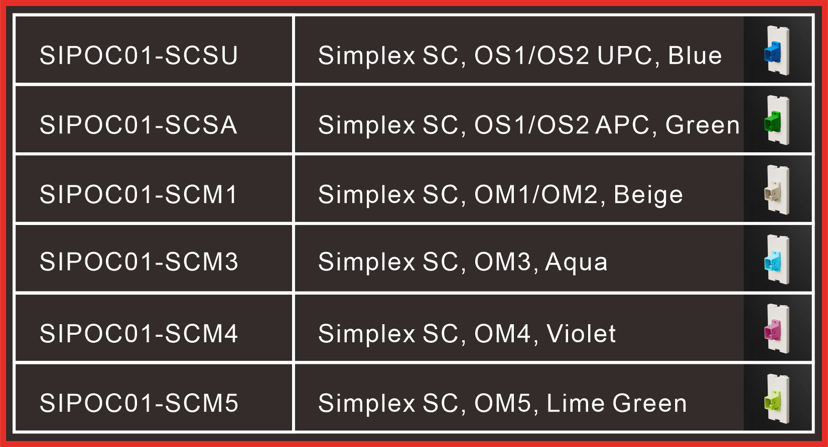 Đơn vị SIP được trang bị một bộ chuyển đổi quang SC Simplex, phù hợp cho các hệ thống doanh nghiệp, viễn thông và cáp cấu trúc. Định dạng SC cung cấp một kết nối đẩy-kéo đáng tin cậy và hỗ trợ sợi đơn chế độ OS1/OS2 và sợi đa chế độ OM1–OM5. Mặc định là bộ chuyển đổi UPC màu xanh OS1/OS2, với các tùy chọn màu mã hóa APC xanh lá, be, aqua, tím và xanh chanh.